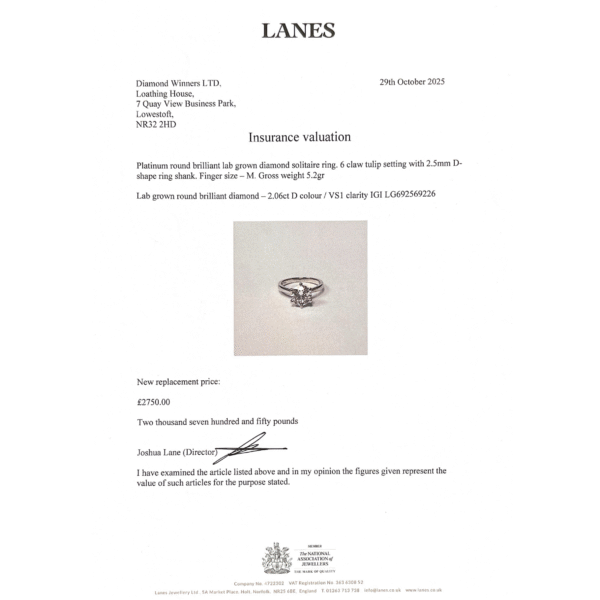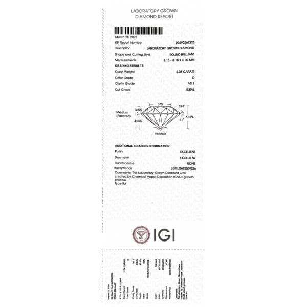 2.06 Carat. D Colour. VS1 Clarity. Round Brilliant Cut